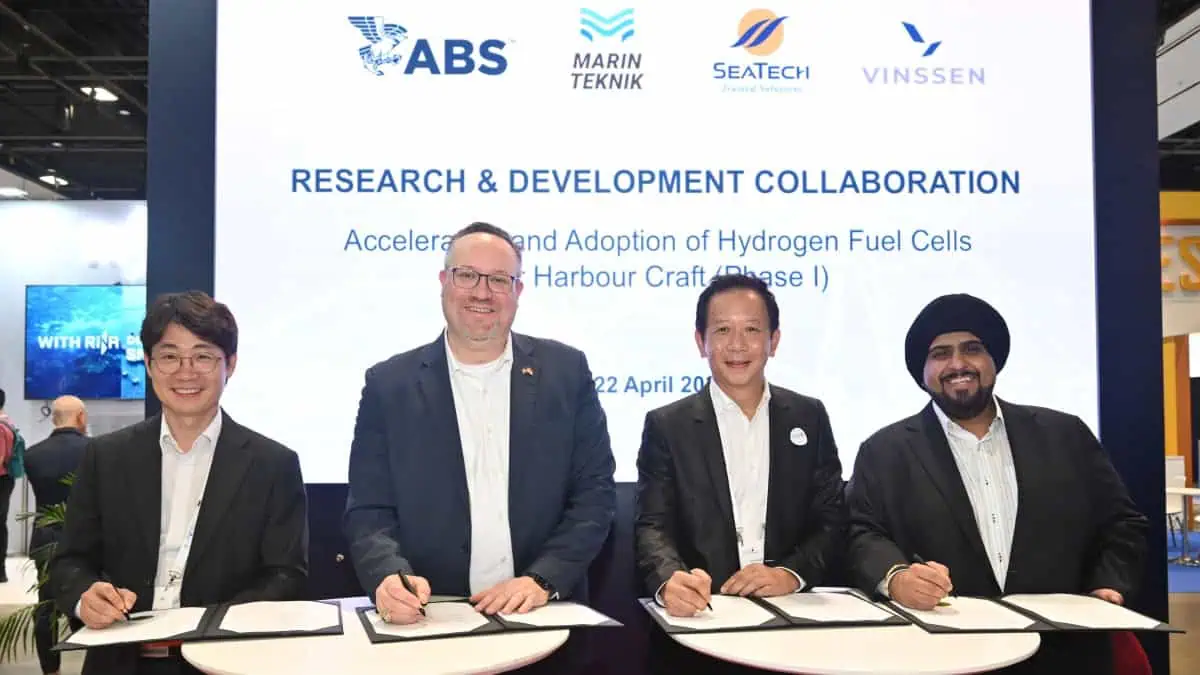 ABS, Marinteknik Shipbuilders, SeaTech Solutions International and VINSSEN have signed a research collaboration agreement to advance the development of a hydrogen fuel cell-powered harbour vessels in Singapore, marking a significant step toward reducing emissions in one of the world’s busiest ports.