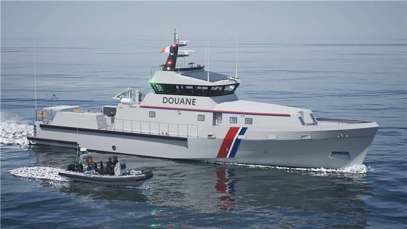 Further requirements include a stern ramp for RHIB deployment, replacing the traditional davit system, and an integrated drone platform above the ramp. The vessel is designed to achieve 1,000 nautical miles range at 18 knots in Sea State 3 as specifically required by the French Customs.