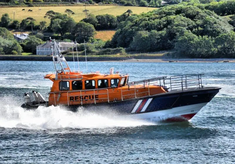The Hamiltion jets feature ‘Sea Anchor’ allowing the craft to automatically hold position, with a second external steering and manoeuvring position on the aft deck facilitating casualty recover via the aft platform or cabin side swing out davit. The side railings are also hinged inwards preventing damage to them coming alongside vessels in rough conditions and the hull is heavily fendered with strong but lightweight polyurethane fender for protection.